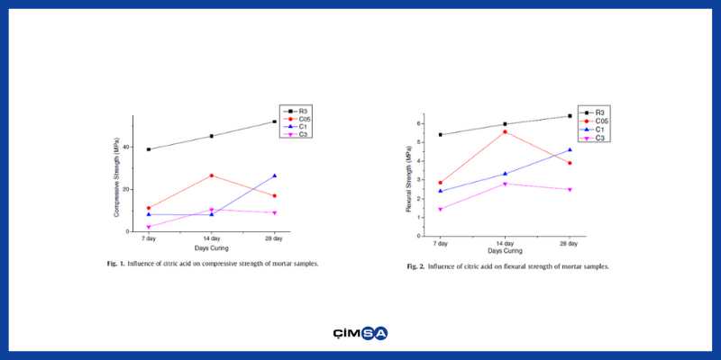 - Specified in the figures above and in the mortar recipe, C3 contains 3% citric acid admixture. On the other hand, R3 is a mixture that does not contain citric acid admixtures. Considering the compressive and tensile strengths of the two mixtures, the 7-day compressive and flexural strengths of the C3 mixture was observed to decrease to 6.22% and 26.85% of the R3 mixture, respectively.
